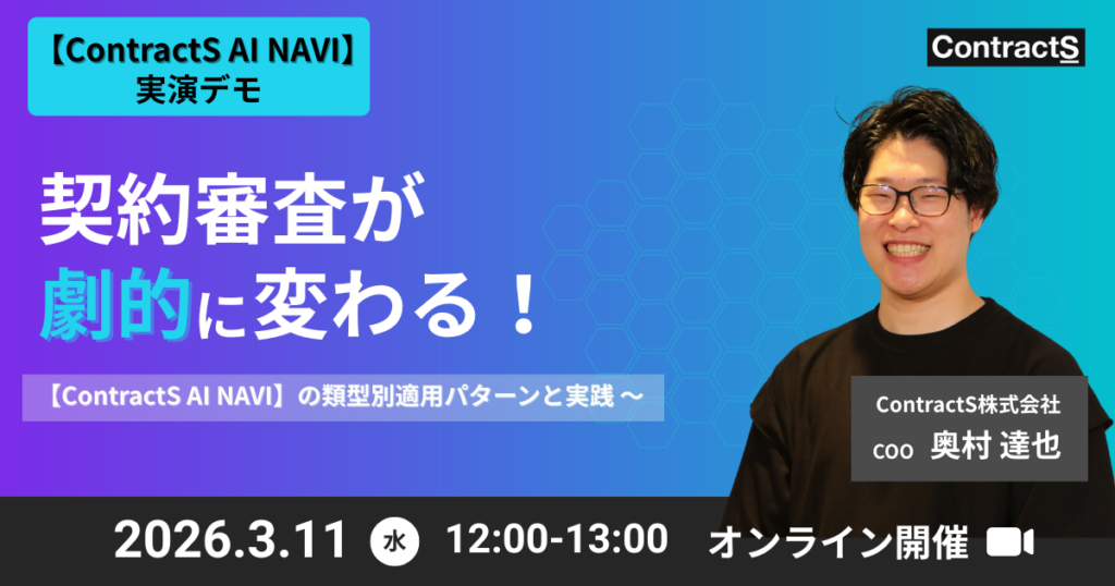 【3/11(水)開催】契約審査が劇的に変わる!(デモ有り)〜 【ContractS AI NAVI】の類型別適用パターンと実践 〜