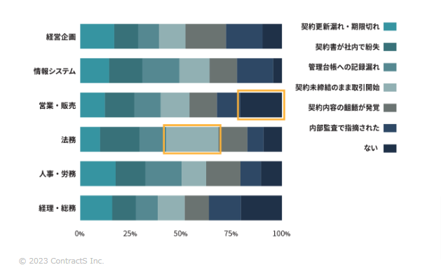 また、契約リスク感度が部署により差があることが見て取れます。契約の窓口になるケースが多い営業・販売では「ない」と回答した割合が最多を占めますが、契約の管理、締結まで包括的に関わる法務では、「契約未締結のまま取引開始」が最多という結果が出ています。