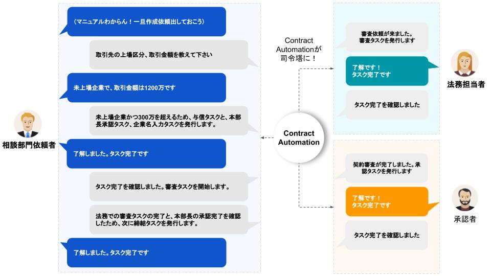 「Contract Automation」が契約書の作成依頼〜審査〜承認〜締結〜管理・保管の契約フロー全体の司令塔となり、適切なタイミングで適切なタスクを、適切な人に自動で割り当てます。さらに、契約書の類型や入力された取引条件を基に、割り当てタスクや割り当て先を自動的に変更し、本来人が行っていた業務を自動化します。