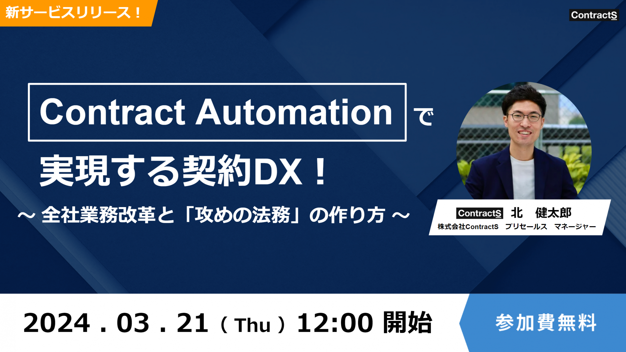 サービスのリリースに合わせて、無料セミナー「【3/21(木)開催】Contract Automationで実現する契約DX!〜全社業務改革と攻めの法務の作り方~」を実施いたします。