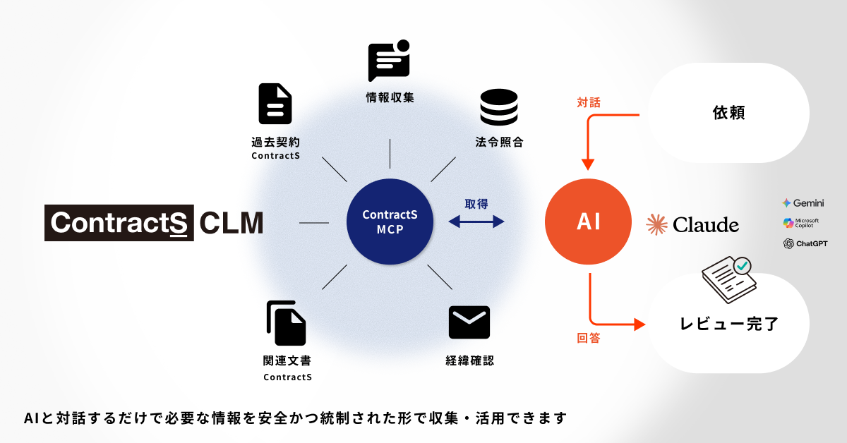 ContractSが構築するのは、企業が日常的に利用しているAI(Claude、ChatGPT、Geminiなど)から、ContractS CLMの機能を直接呼び出し、契約業務をAIに任せられる環境です。