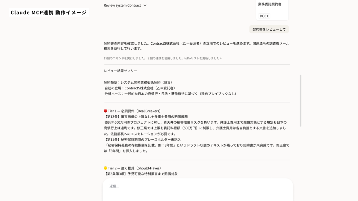 レビュースキル ContractS CLM上のレビュータスクに割り当てられた契約書を、Claudeが直接取得してレビューを実行します。ContractS CLMの業務フローの中にAIレビューが自然に組み込まれるため、ファイルの手動アップロードや画面の切り替えが不要です。