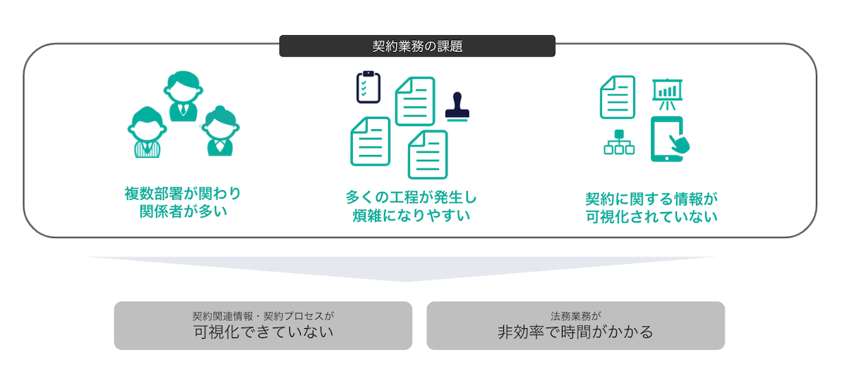 そして、これら3つの本質的な契約の課題によって、「契約関連情報・契約プロセスが可視化できていない」「法務業務が非効率で時間がかかる」といった現場の困りごとが生じています。